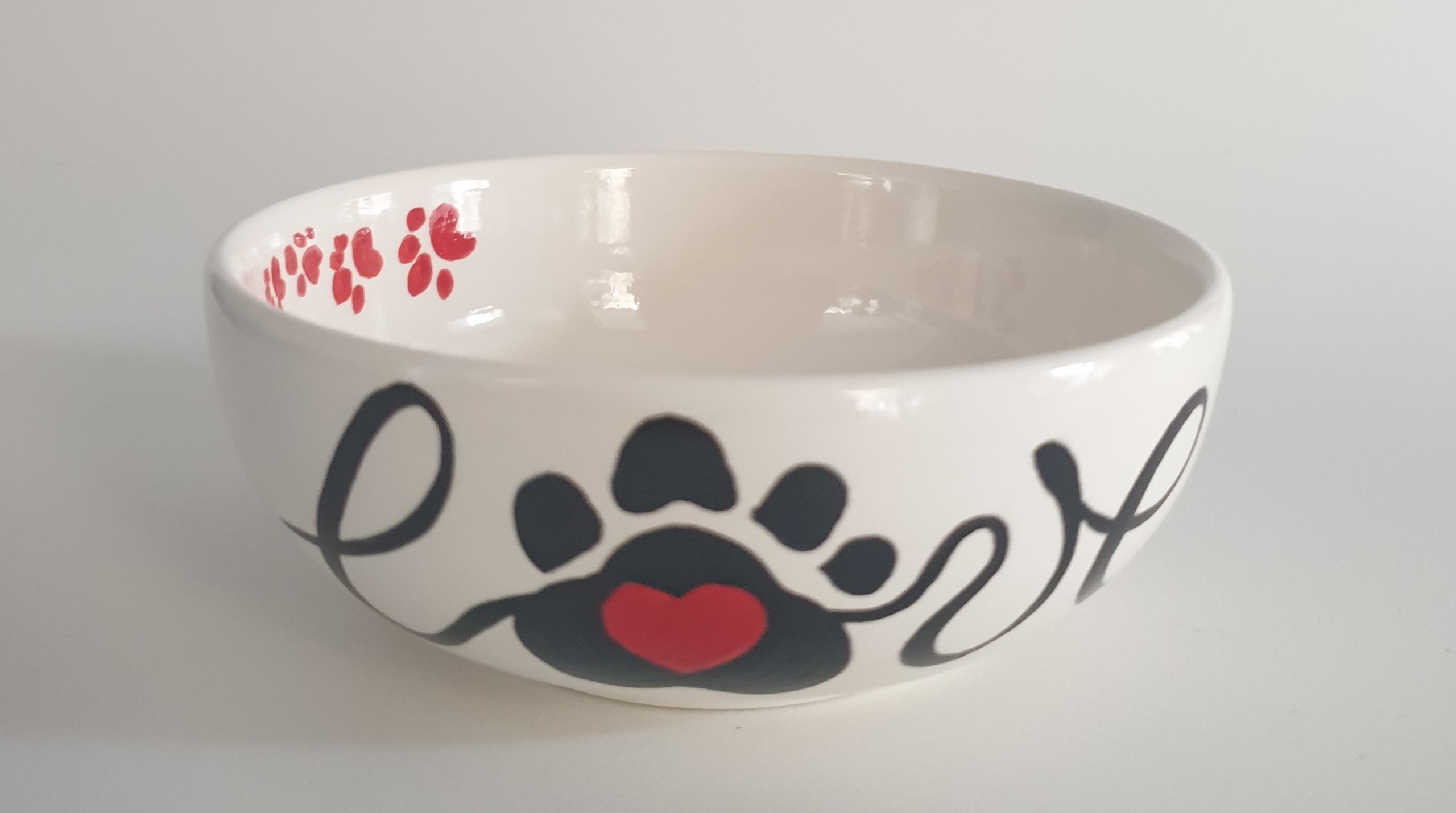 Ciotola dipinta a mano, personalizzabile con il nome del tuo FEDELE AMICO, può essere realizzata anche con altri colori e in altre dimensioni. Puoi scegliere come disegno principale  il disegno della zampetta o  la scritta love, e dall’altro lato scriveremo il nome del tuo cane/ gatto o altro animale.